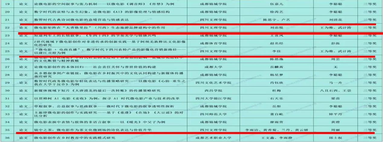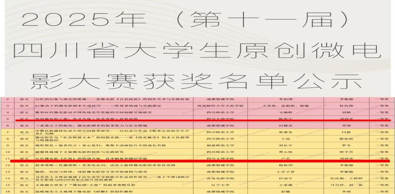 近日,四川省2025年(第十一届)大学生原创微电影大赛评选结果揭晓。我校文学与传播学院推选的多个作品,从全国及海外67所高校的477部决赛作品中脱颖而出,共荣获论文类一等奖1项、二等奖1项、三等奖4项,以及导演类二等奖1项,整体表现优异,展现出学院在学术研究与专业创作融合育人方面的扎实成效。
