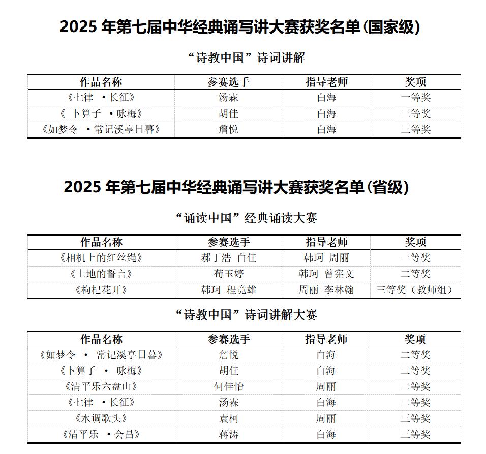近日,第七届中华经典诵写讲大赛评选结果正式公布。文学与传播学院学生凭借扎实的专业功底与出色的创新能力,在“诵读中国”经典诵读与“诗教中国”诗词讲解两大板块中共荣获国家级奖项5项,其中一等奖1项、三等奖2项、优秀奖2项;省级奖项17项,包括一等奖1项、二等奖5项、三等奖3项及优秀奖8项,取得显著成绩。