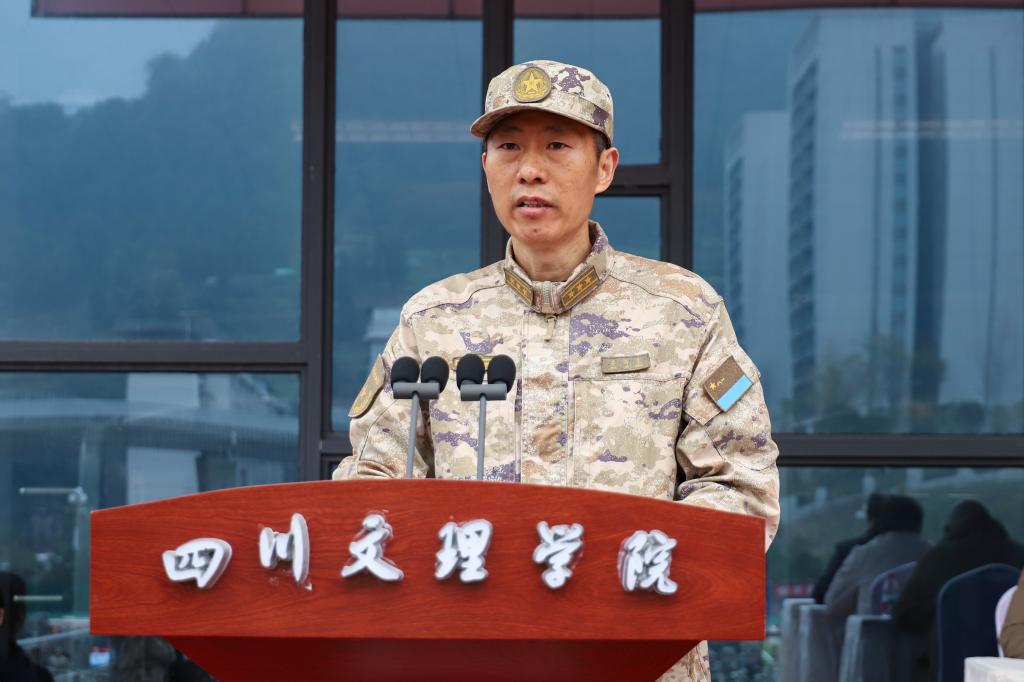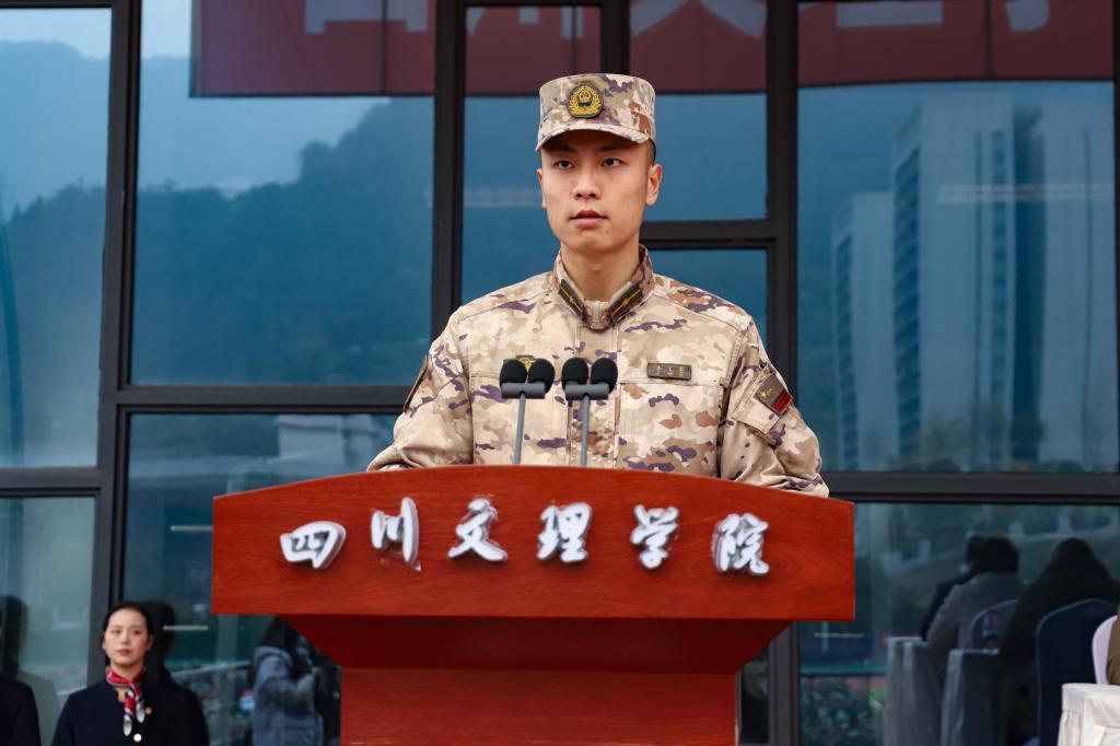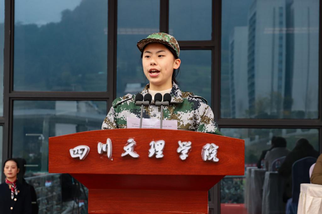 我院2025级3班汉语言文学专业学生杨健淇作为学生代表发言。她表示,将以川陕红色精神和塔石精神为引领,坚决听从指挥,严守团队纪律,凝聚集体力量,磨砺个人品格,在军训中涵养家国情怀、锤炼过硬作风,并将军训养成的自律习惯延续至今后的学习生活中,以实际行动助力学院发展,用青春奋斗书写时代担当。