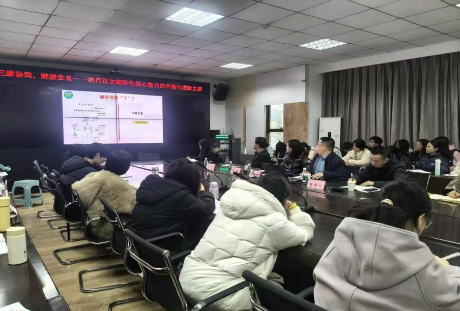 11月20日下午,双河中学唐全周书记受邀在艺术传媒楼1007会议室作 “三维协同、赋能生长——当代汉文师范生核心能力的平衡与进阶之路” 主题讲座。学院汉语言文学专业“卓培班”学院参与学习交流,讲座由副院长周丽博士主持。